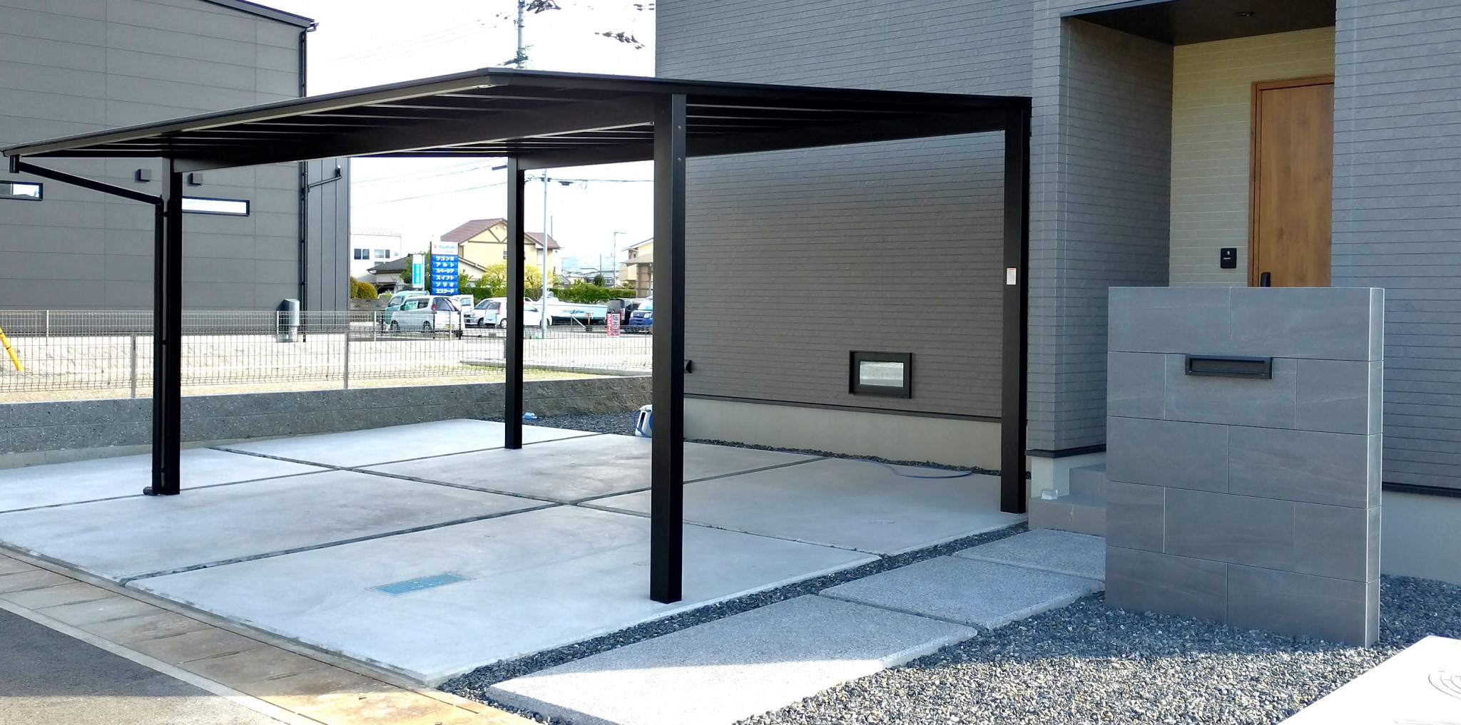 お洒落なタイル門柱の隣にブラックカーポート、柔らかくもありすっきりひきしまった仕上がりもになりました。